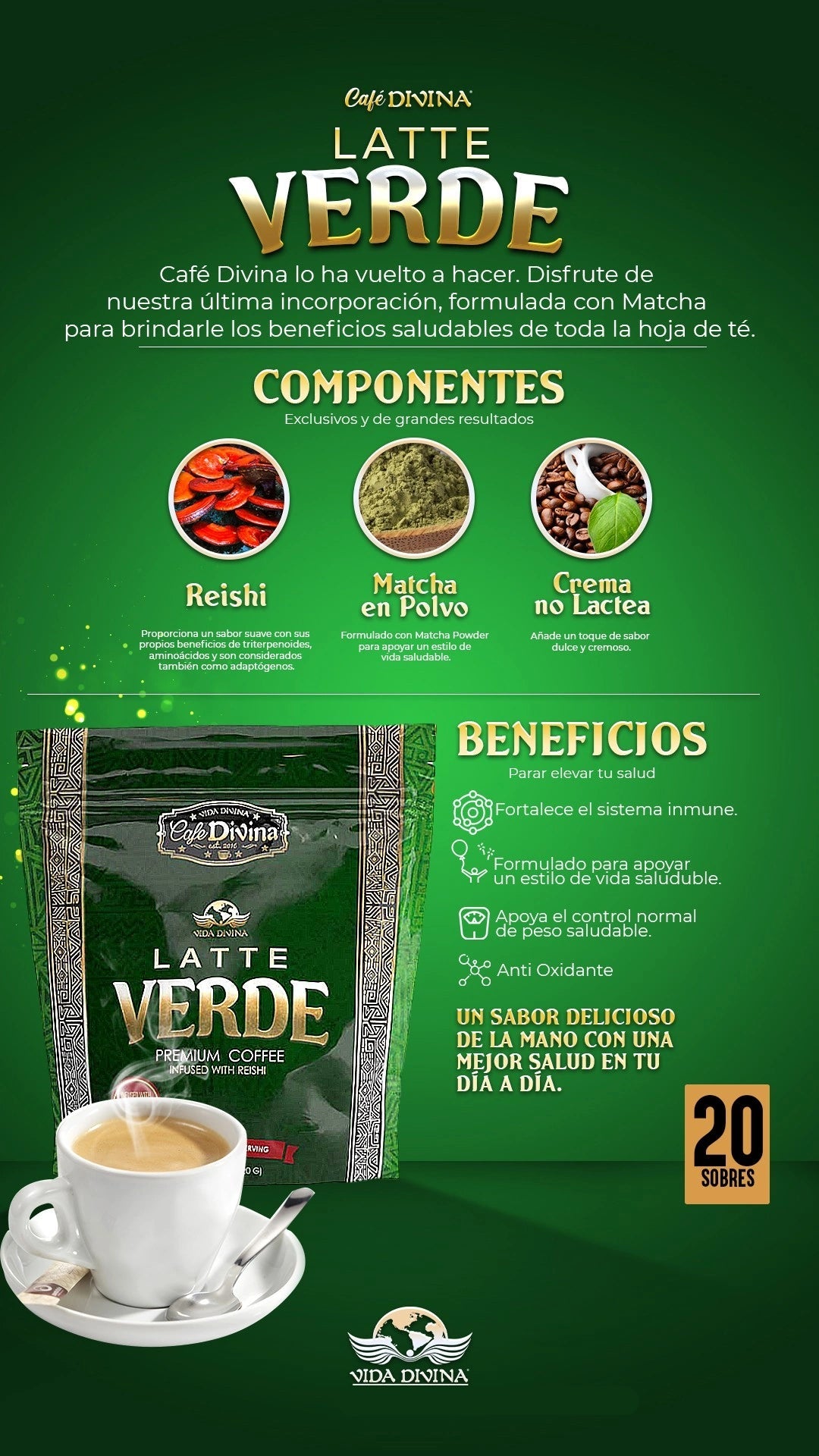 Cada bolsita contiene Reishi y polvo de Matcha. No espere más en su cafetería local y disfruta de nuestra mezcla energizante.