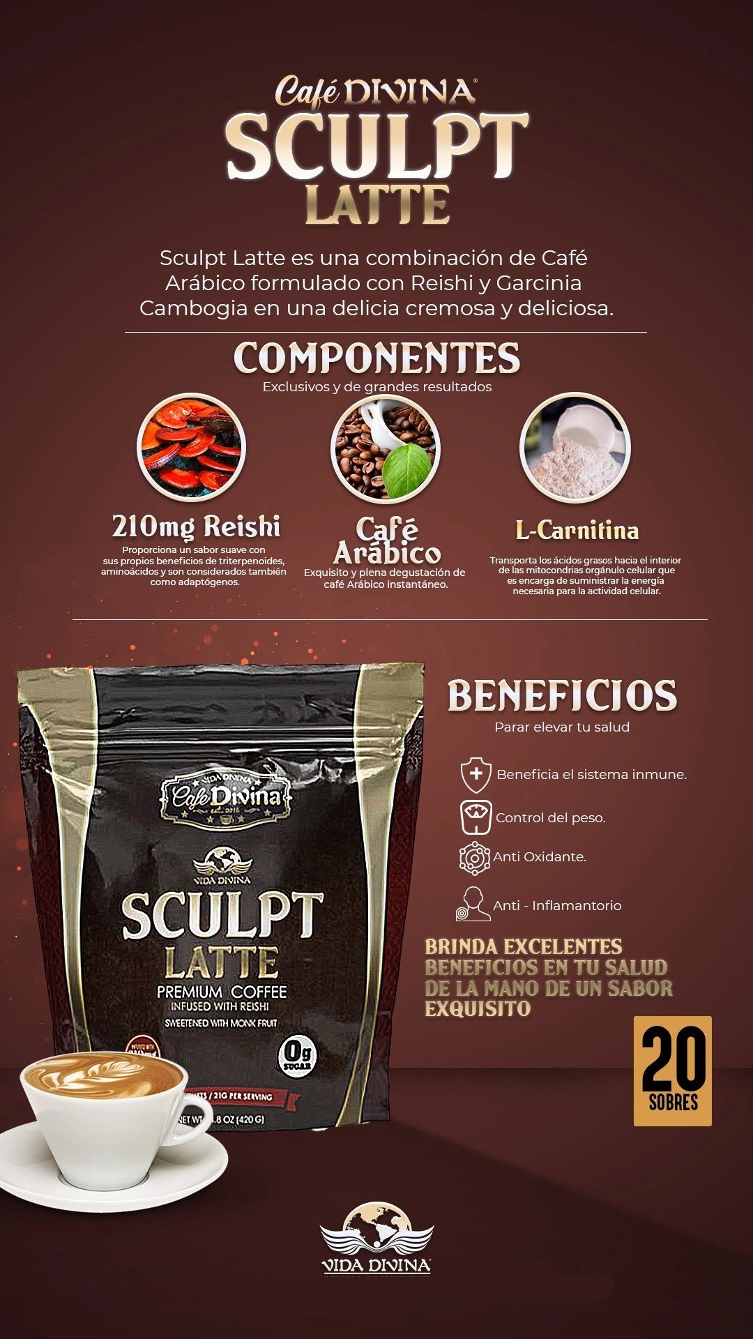 Sculpt Latte es una combinación de Café Arábico formulado con Reishi y Garcinia Cambogia en una delicia cremosa y deliciosa.