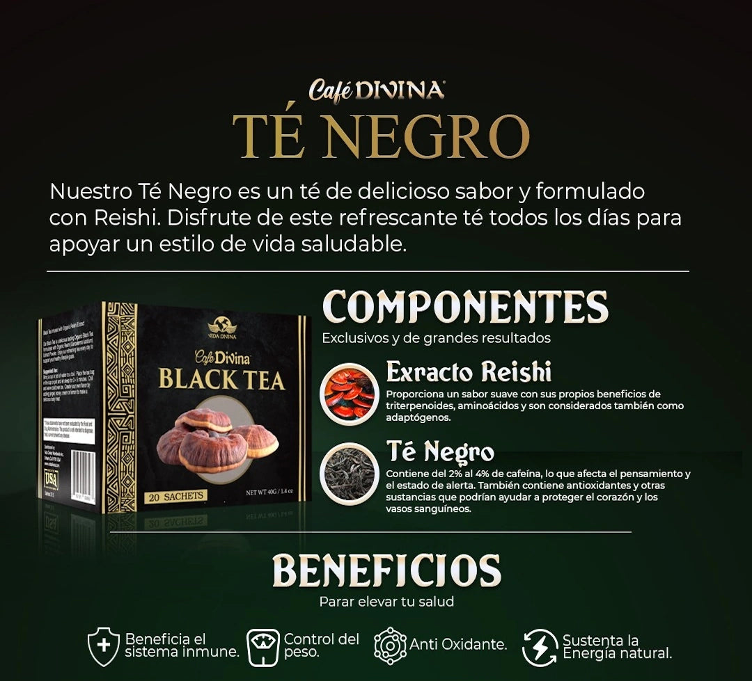 Nuestro Té Negro es un té de delicioso sabor y formulado con Reishi. Disfrute de este refrescante té todos los días para apoyar un estilo de vida saludable.